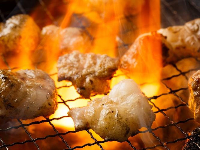 七輪を囲んで食べる、当店の焼肉。
